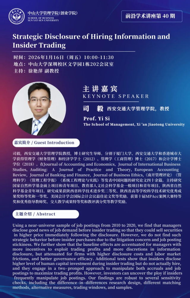 讲座预告 | Strategic Disclosure of Hiring Information and Insider Trading