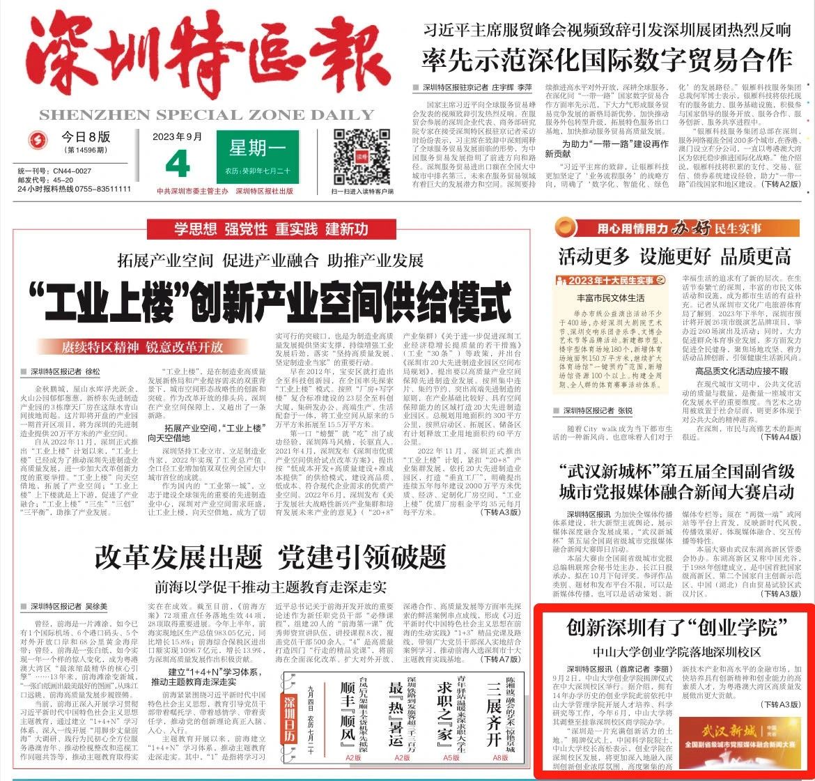 9月4日,深圳特区报头版刊发报道了,中山大学创业学院落地深圳校区。