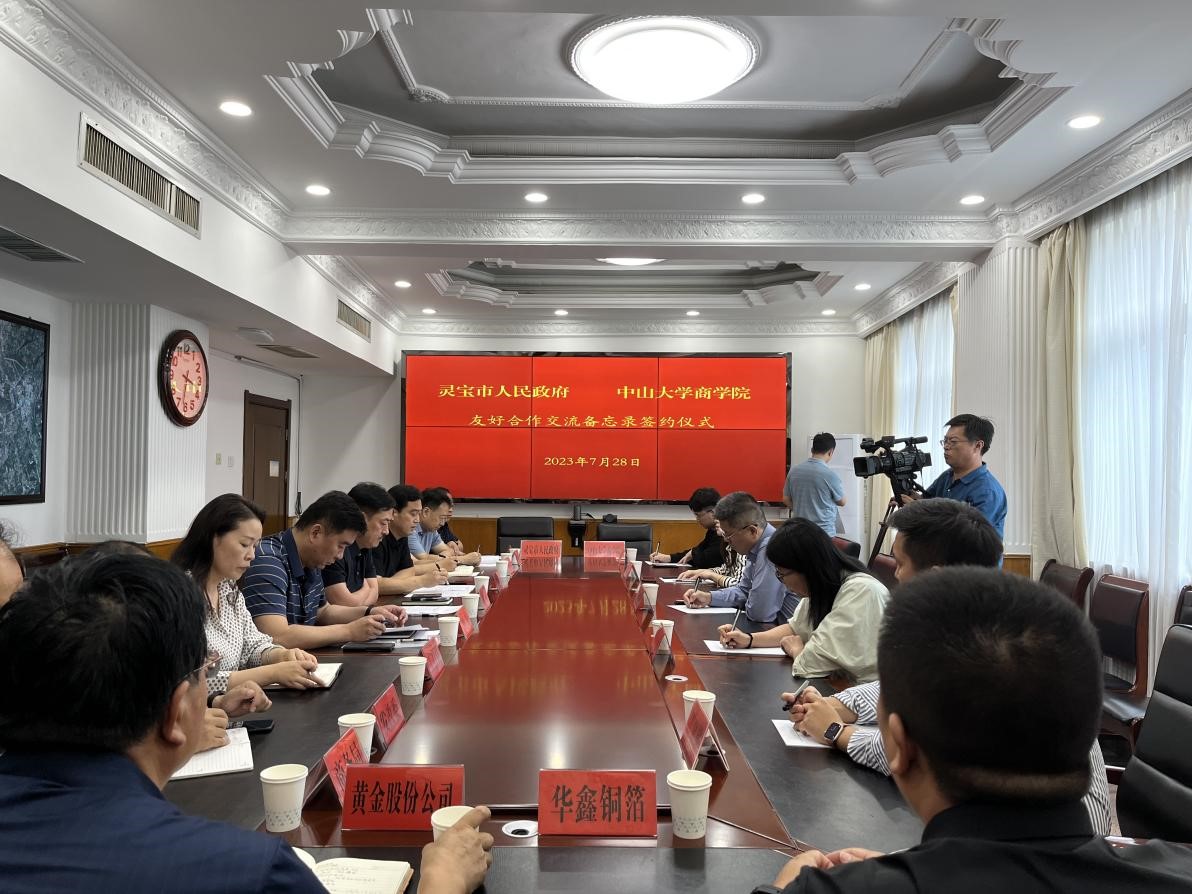 随后,灵宝市人民政府与中山大学商学院在市政府1号会议室召开座谈会,就促进灵宝市经济产业结构调整,提高校地合作创新能力等方面进行合作洽谈。灵宝市先进制造业开发区党工委书记、管委会主任王伟指出,灵宝历史悠久、文化灿烂、资源丰富,素有“黄金之城、苹果之乡、道家之源、宜居之地”的美誉。王伟指出,希望中山大学商学院将更多人才、更多技术、更多资源、更多创新理念投放在灵宝,共建众创空间、孵化器等创新创业孵化载体,灵宝将坚持全链条服务、全生命周期保障,竭力营造最舒心、最高效的环境,打造科研成果加速转移转化的首选地。国投金城冶金有限责任公司党委书记、总经理刘辉在会上介绍了企业基本情况及在数字化赋能等方面的合作意向。李广众院长指出,中山大学是孙中山先生于1924年创办,是教育部直属、高水平研究型综合性大学,入选首批国家“双一流”A类、“985工程”、“211工程”高校名单,学校立足粤港澳大湾区核心增长极城市办学,形成广州、珠海、深圳“三校区五校园”办学格局,综合实力排名全国前8;中山大学商学院坐落于深圳特区,依托学校深厚的文化传统和学术底蕴,以“四个面向”为指导,重点围绕经济与商业管理的重点领域开展科学研究,服务国家创新驱动发展战略和地方经济社会发展。李广众指出,中山大学商学院期待与灵宝市人民政府通过多领域、多层次、全方位的密切合作,促进灵宝市经济体系和产业结构调整、优化和升级,为推动灵宝市社会经济发展贡献中大智慧。会上,双方围绕人才培养、实习实践、创新创业孵化和数字化赋能等方面展开交流,并达成了战略合作意向。