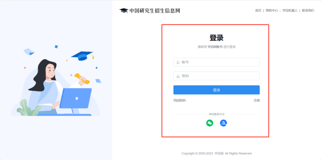 2、使用学信网帐号进行登录。若无账号请先进行实名注册,相关信息请务必与有效身份证信息保持一致。