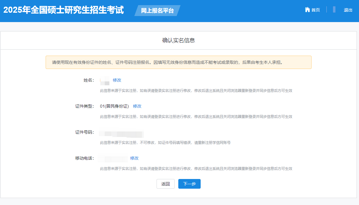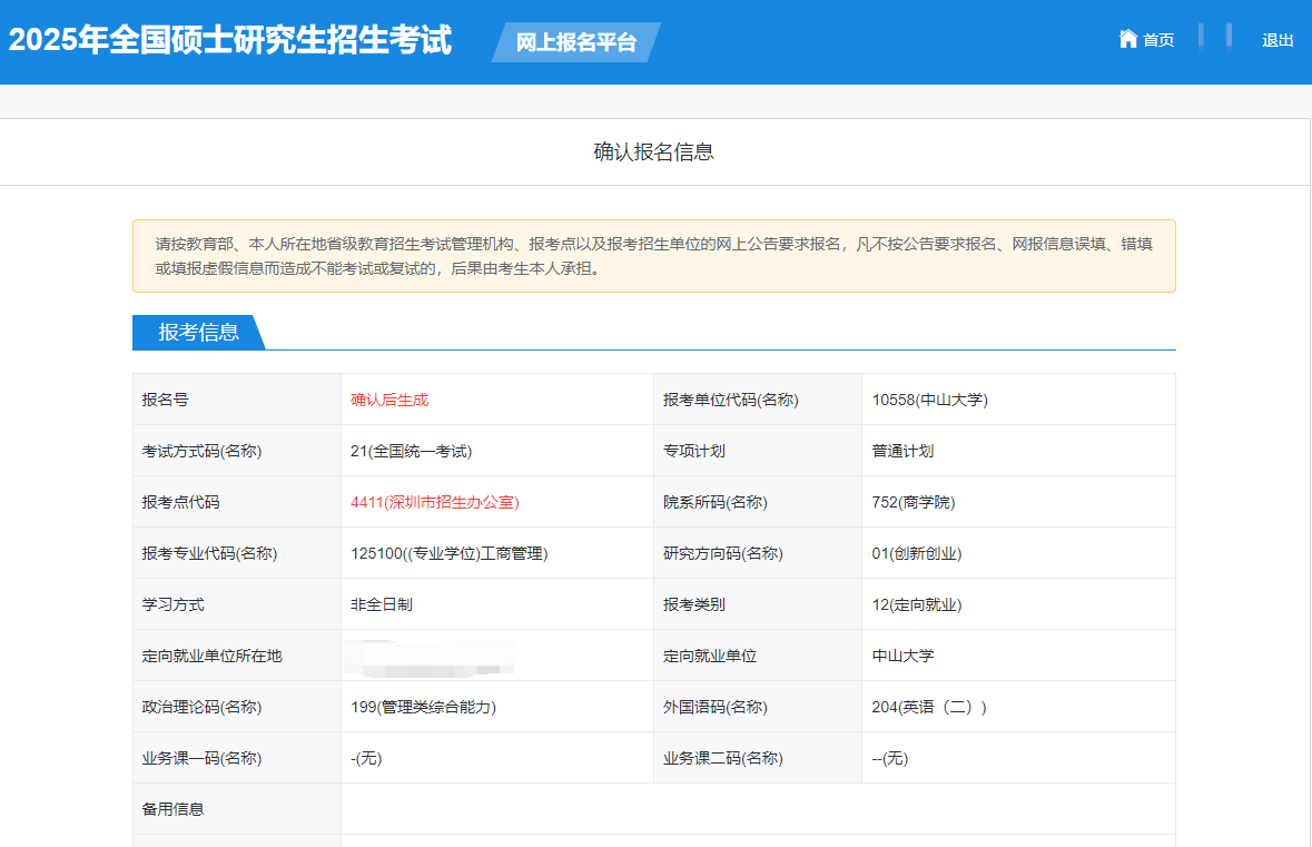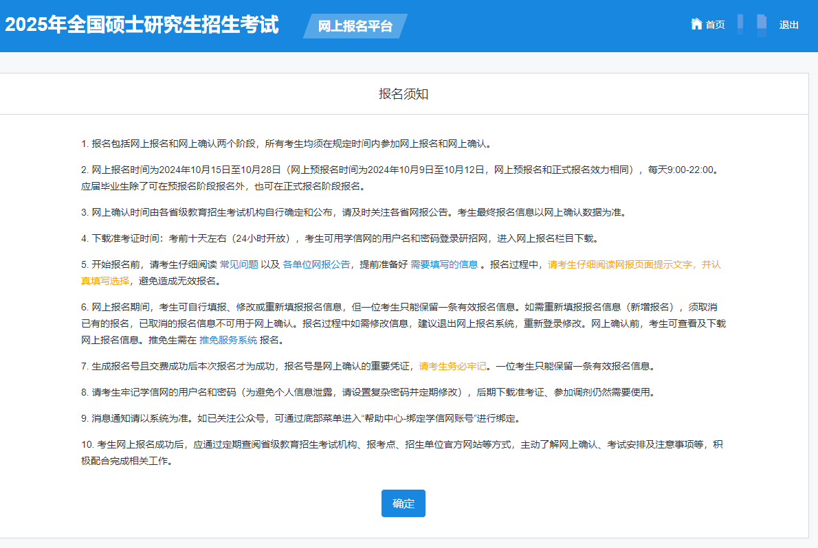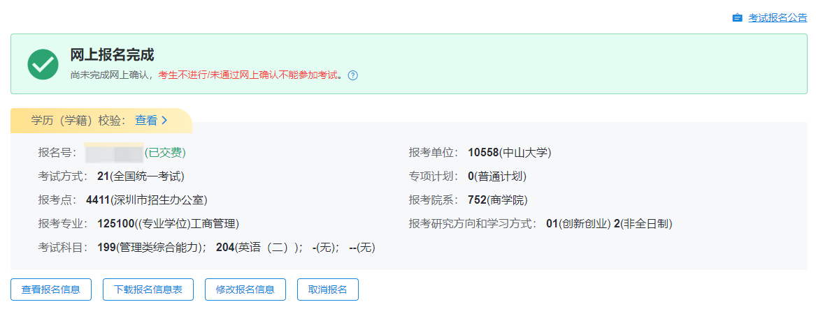 7、确认报名信息:请按教育部、本人所在地省级教育招生考试管理机构、报考点以及报考招生单位的网上公告要求报名,凡不按公告要求报名、网报信息误填、错填或填报虚假信息而造成不能考试或复试的,后果由考生本人承担。报考信息一旦提交不可修改。