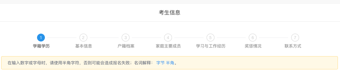 2、进入“考生信息”流程进度栏,包括:学籍学历、基本信息、户籍档案、家庭主要成员、学习与工作经历、奖惩情况、联系方式等模块。填写考生信息时,请认真阅读报名页面的提示信息,准确填报,带*的文本框为必填内容。