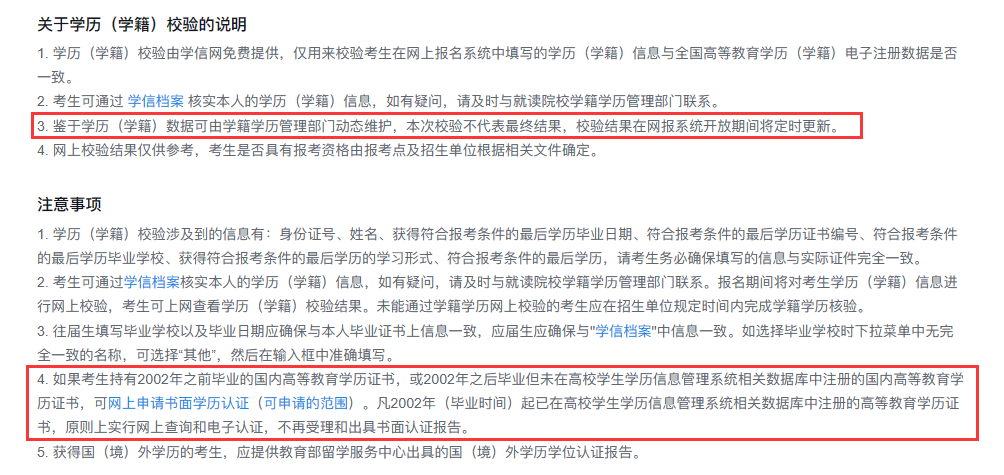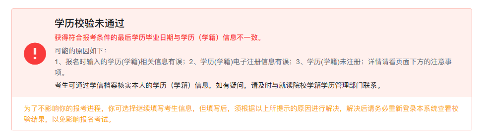 l 若出现学历校验未通过(如下图所示),此时仍可继续进行报名流程。但应在完成报名后准备学历验证报告,以备后续在网报信息确认阶段使用。
