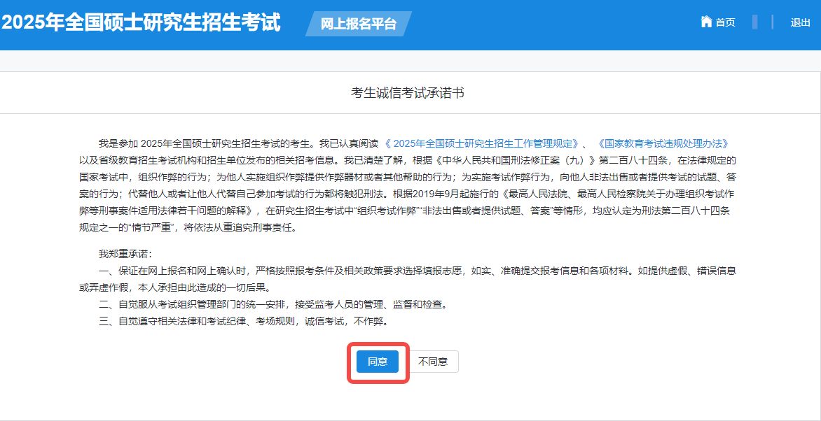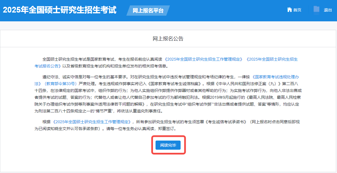 请仔细阅读网上报名公告后,点击“阅读完毕”,进入考生诚信考试承诺页面,仔细阅读后。点击“同意”。