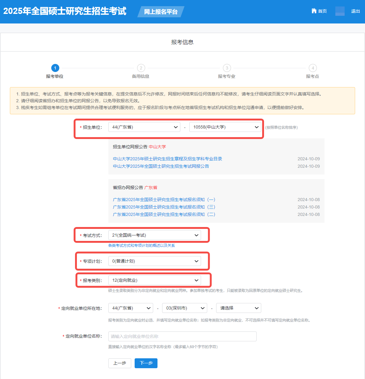 招生单位:下拉菜单拉至最下方:44(广东省)10558(中山大学),并请仔细阅读省招办和招生单位的网报公告,以免导致报名无效。