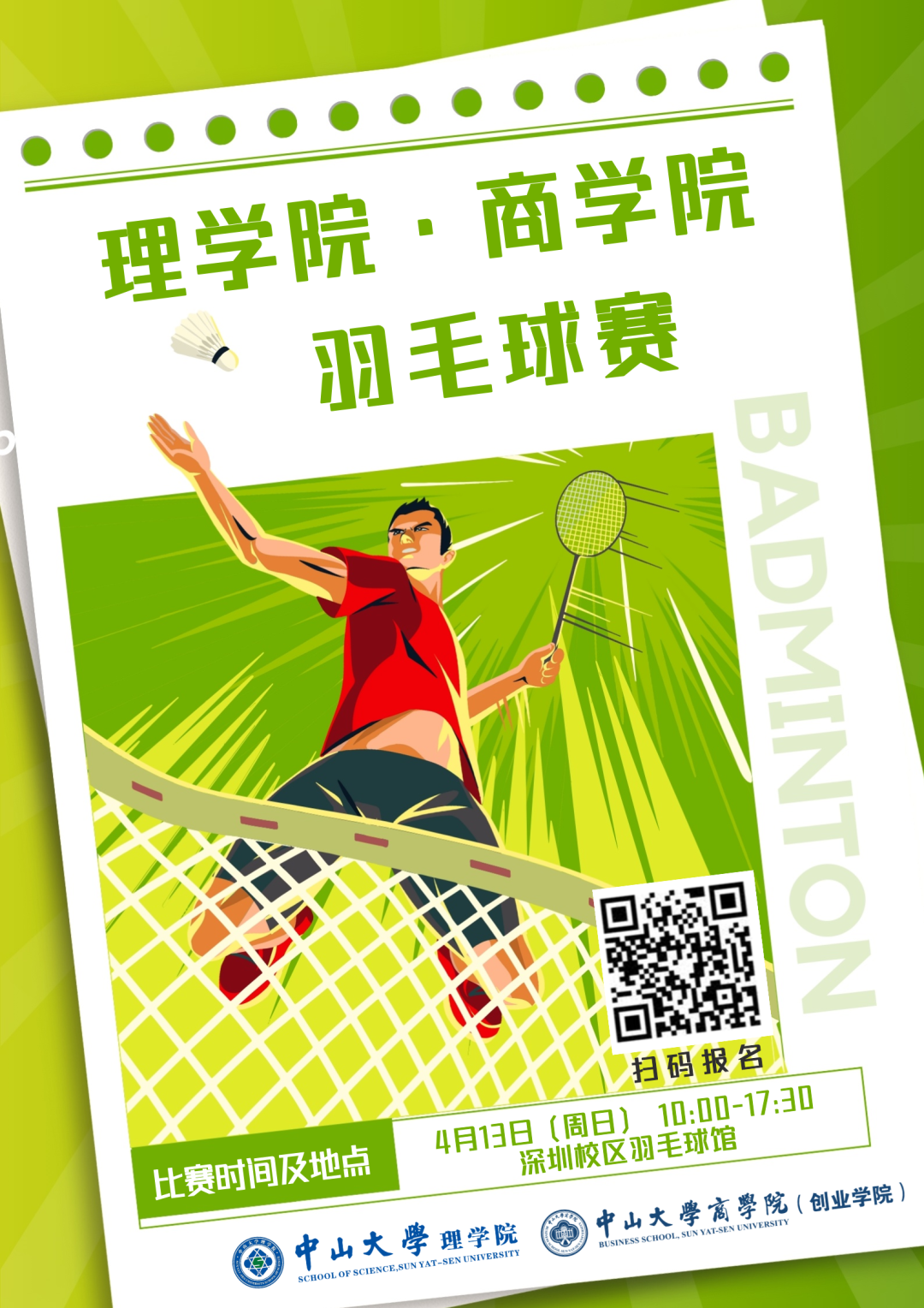 让我们共同期待这场力与美的碰撞,见证属于理学和商才的荣耀时刻!你的每一次跃起扣杀都值得被记录,这个春天,让羽毛球划出的弧线成为校园最美的风景线!